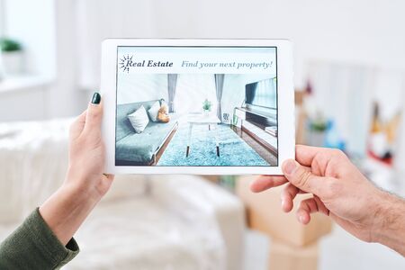 Hands of young man and woman holding touchscreen with advert of new luxurious apartment or house in new district