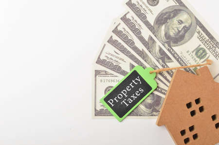 Property taxes text on brown paper house model with dollar banknotes on dark wooden table. Concept for real estate property tax.