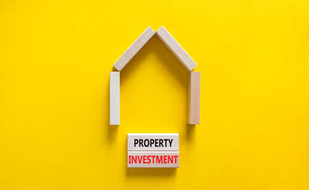 Property investment symbol. Concept words Property investment on wooden blocks on a beautiful yellow table yellow background. Wooden house model. Business Property investment concept. Copy space.