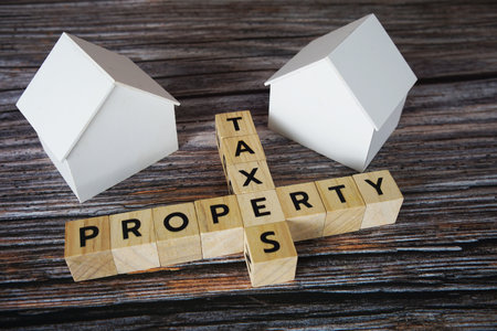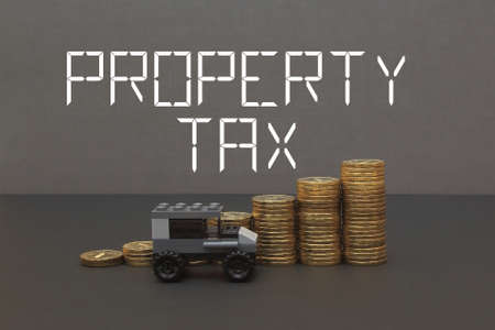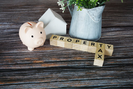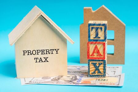 Property tax word made with wood building blocks. Conceptual image.