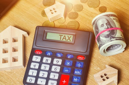 Property tax reminder on calculator and house model.