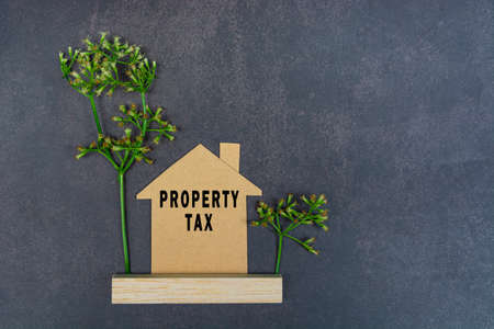 Property tax text on brown paper house model on dark wooden table with green plant. Concept for real estate property tax.