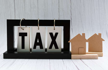 Tax text on paper stand black frame with house model on white wooden background. Property tax and tax time concept