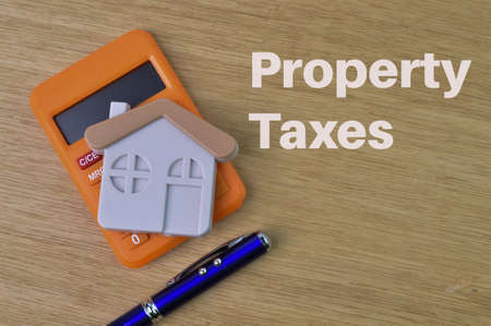 Toy house, pen and calculator over wooden background written with PROPERTY TAXES.