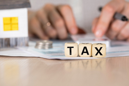 Toy house and wooden cubes with word TAX.