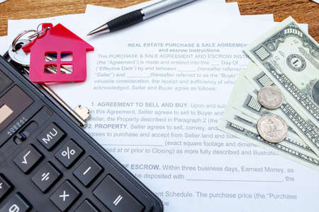 House, home, property, real estate purchase buying sale contract agreement pen money coins keys wooden background, expenses, buying, investment, finance, savings, concept close up selective focus