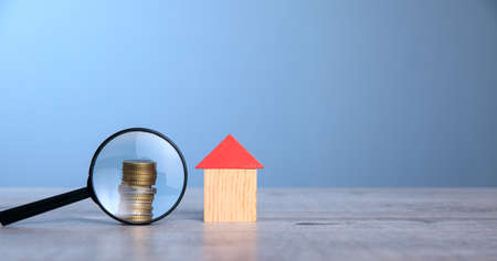 Wooden house keychain, stacks of coins, calculator and magnifier on a blue background.
