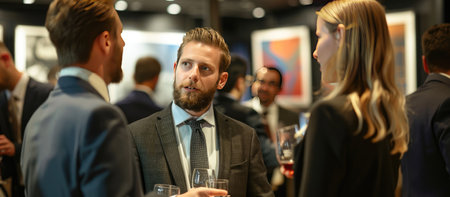 A smiling businessman in glasses and a suit at a networking event, surrounded by other professionals engaging in conversation