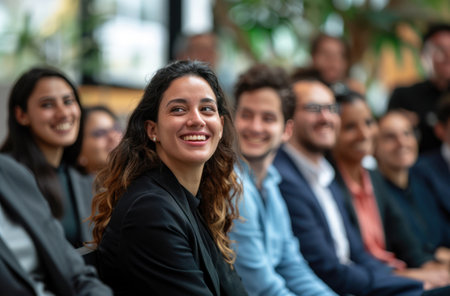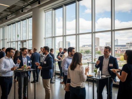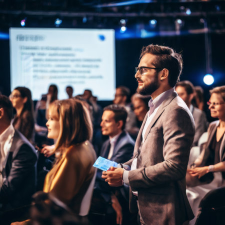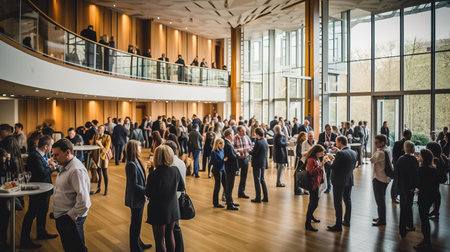 A dynamic business conference showcasing a diverse audience engaged in a presentation. The modern glass building offers a bright atmosphere, enhancing collaboration and networking opportunities.