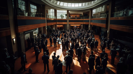 Attendees engage in a major political conference in a modern hall with sleek designs and high-tech screens showcasing key information.