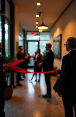 Businesspeople are cutting a red ribbon at a grand opening ceremony, celebrating the launch of their new venture in a modern office building