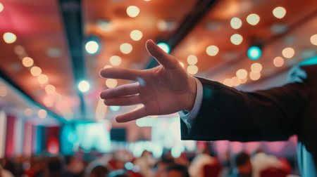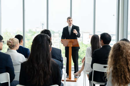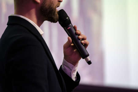 Next Level. Cropped shot of young caucasian male speaker in suit presenting his colleagues while giving a talk at business meeting, economic forum