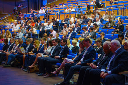 Svetlogorsk, Russia - July 29, 2017: Audience listens to the lecturer at Amber Forum. 360 VR panorama