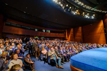 Moscow, Russia - March 27, 2018: People attend blockchain conference in congress hall