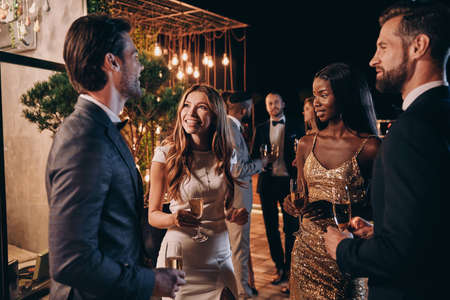Group of people in formalwear communicating and smiling while spending time on luxury party