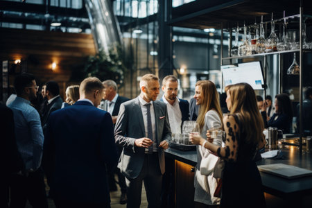 A diverse group of individuals standing around a bar engaged in lively conversation, People networking at a hip business event, AI Generated