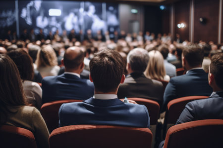 Very large auditorium with people sitting in the chairs watching the presentation Generative AI Illustration.