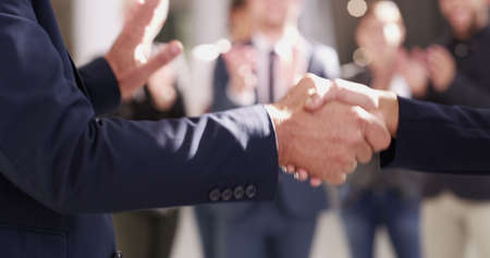 Nice stylish professional cheerful top managers wearing dark suits shaking hands welcome to new startup finance invest project conference at industrial loft interior room work place space indoors