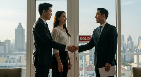 Three friends smile while shaking hands outside, overlooking city views, with Sold signs held by others suggesting recent transactions An upbeat, positive atmosphere characterized