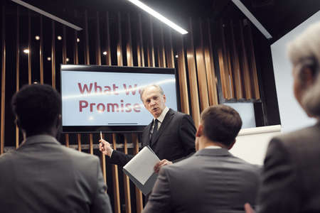 Confident senior business coach in black suit holding clipboard and pointing at plasma screen while explaining marketing strategy