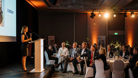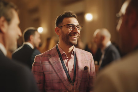 Entrepreneur wearing a badge, laughing and networking with colleagues at a gala dinner in a luxury venue