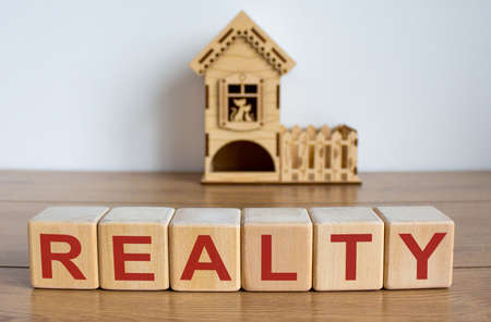Cubes form the word 'realty' in front of a miniature house. Beautiful white background. Business concept.