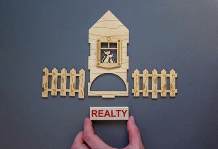 Model of a wooden house. Word 'realty' on wooden block. Male hand, wooden fence. Copy space. Business concept. Beautiful gray background.