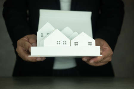 Real estate agents are carrying a housing model of the project to be forwarded to customers as home delivery. Real estate trading ideas and bank loans for buying and selling houses and land.