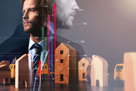 elegance caucasian Successful businessman with houme model financial graph chart and red arrow rising up