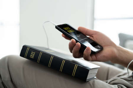 Preacher Listening Bible On Phone. Praying With Headphones