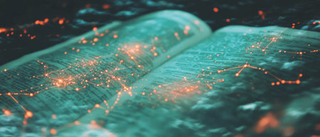 In a warmly lit, quiet room, timeless wisdom from an old, leather-bound book sits beside the real-time data of the modern stock market on a digital tablet.