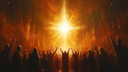 vibrant scene of human figures reaching towards radiant star, expressing hope and unity.