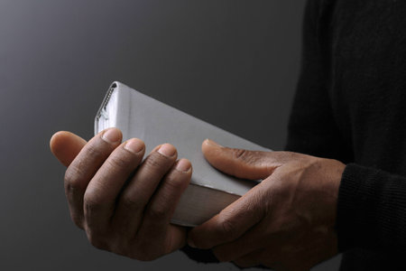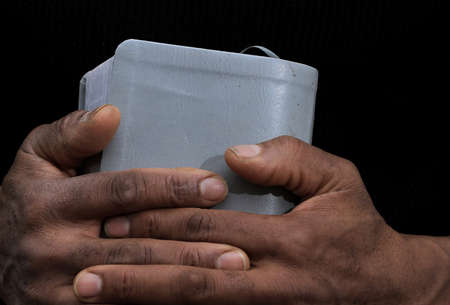 man praying with hand on bible black background stock photo