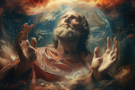 Divine creation narrative, biblical concept of God creating the world and everything in it in six days. Religion Theology.