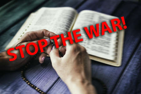 Stop war - inscription. Background of blurred female hand and bible in prayer. An appeal to God, a prayer for an end to the war.