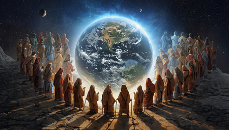 Mystical scene with group of people and planet. 3D rendering