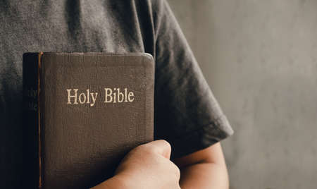 Close up of a old Holy Bible on human hand