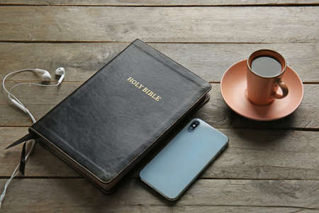 The Holy Bible with headphones, a phone and a hot cup of coffee. Reading the bible. Concept for faith, spirituality and religion.