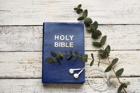 Holy Bible, eucalyptus branch and earphones on light wooden background