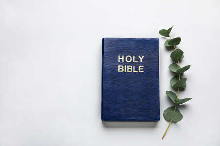 Holy Bible and eucalyptus branch on light background