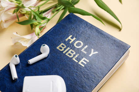 Holy Bible, alstroemeria flowers and earphones on color background, closeup