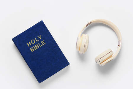 Holy Bible and modern headphones on white background