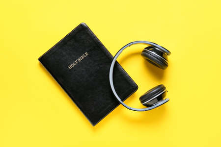 Holy Bible and modern headphones on color background