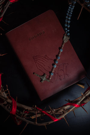 Top view of Bible verses with blurred Holy Rosary Background. Christianity concept