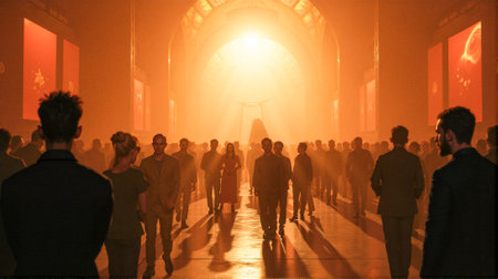 A diverse crowd explores an art gallery, captivated by illuminated exhibits as warm light fills the space, creating an enchanting atmosphere.