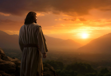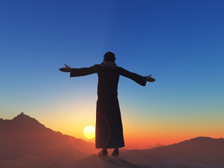 Portrait of Jesus Christ in his traditional white robe against sunset sky background.