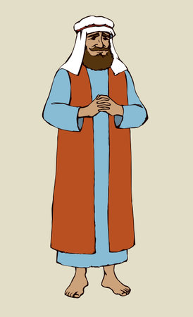 Adult beard nomad wanderer go to worship. Aged middle east judaic jesus christ rabbi preacher apparel: shemagh hat, robe, thobe. Line black ink hand drawn human logo sign icon in retro cartoon style