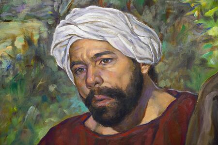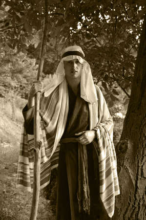 Retro rural rustic adult age islam forest travel nomad male human guy hold wood staff farm worker think pray love hope face. Middle east asian robe cloth holy Israeli Lord God Jesus faith believ story