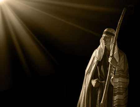 Close up retro eastern holy Jesus Christ adult age wise saint male human rear clip path view. Middl east travel robe cloth Lord law hope torah exodus story magic egypt wood wand rod arm finger concept
