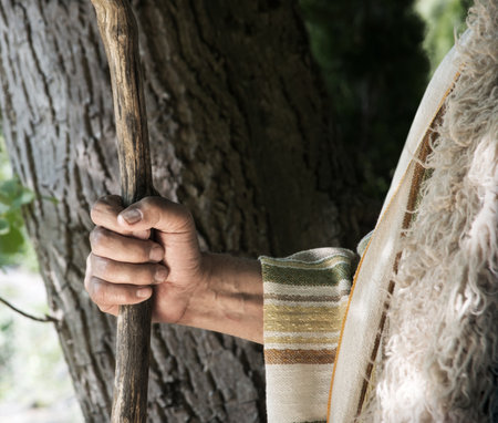 Close up retro rustic tool medieval rural herd devot adult age wise herder worker saint prayer John baptist Middl east holy jew Joseph fur robe cloth walk Lord pray hope bible story rod symbol concept